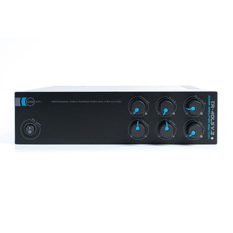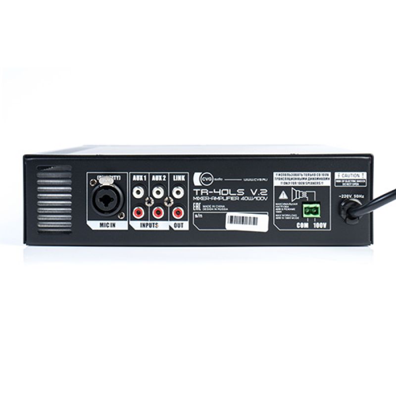 CVGaudioTR-40LS - миниатюрный экономичный настольный микшер - усилитель для создания бюджетной системы фонового звука в небольших магазинах, кафе, ресторанах и других общественных помещениях площадью до 100м2. Благодаря небольшим габаритам корпуса усилителя, для него всегда можно найти место в любом тесном подсобном помещении менеджера магазина, барной стойке или кассовом модуле. Усилитель работает только в составе 100V трансляционных линий, низкоомный режим не предусмотрен. Мощность усилителя TR-40LS - 40W, таким образом, Вы можете подключить к нему до 4-х динамиков мощностью по 10W/100V или до 8-ми динамиков мощностью по 5W/100V. Данная модель имеет два линейных входа (AUX 1 и AUX2) на разъемах 2RCA и микрофонный вход (mic in) - разъем TR Jack 6,3мм. Входящий стереофонический сигнал на 2 х RCA входах AUX 1 и AUX 2 корректно суммируется и далее уже усиливается и выводится на динамики монофонический сигнал, который является более правильным для систем фонового звука, так как обеспечивает корректное равномерное звуковое поле во всех точках помещения. Микрофонный вход имеет приоритет над линейными входами и при появлении сигнала на нем все линейные входа (AUX1, AUX2) автоматически приглушаются.